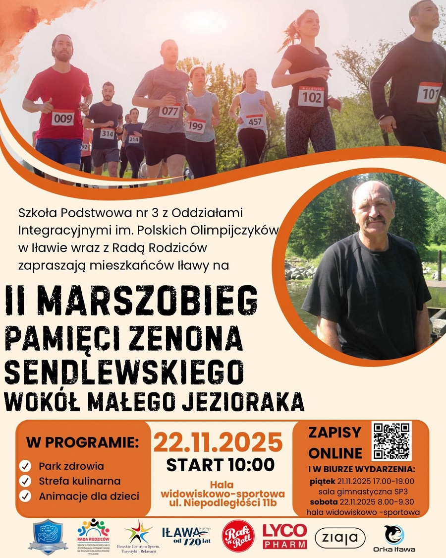 Szkoła Podstawowa nr 3 im. Polskich Olimpijczyków w Iławie wraz z Radą Rodziców zapraszają mieszkańców miasta do udziału w II Marszobiegu Pamięci Zenona Sendlewskiego. Wydarzenie odbędzie się w sobotę, 22 listopada 2025 roku, wokół Małego Jezioraka. Start zaplanowano na godzinę 10:00 sprzed hali widowiskowo-sportowej przy ul. Niepodległości 11b.