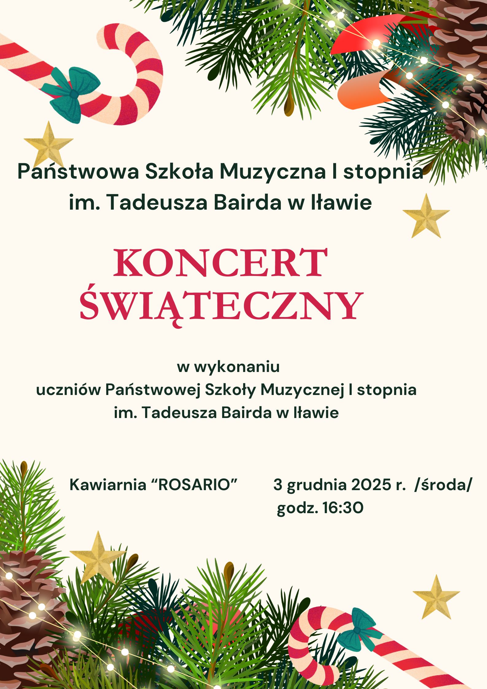 Państwowa Szkoła Muzyczna I stopnia im. Tadeusza Bairda w Iławie zaprasza na Koncert Świąteczny, który odbędzie się 3 grudnia 2025 r. o godz. 16:30 w kawiarni Rosario.