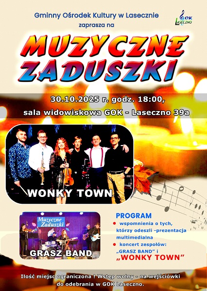 Gminny Ośrodek Kultury w Lasecznie zaprasza na wieczór refleksji i muzyki. Muzyczne Zaduszki odbędą się 30 października 2025 roku o godzinie 18:00 w sali widowiskowej GOK w Lasecznie.